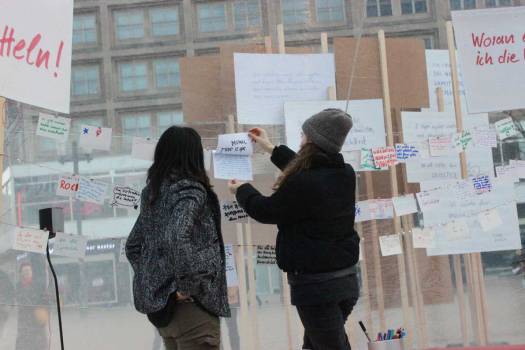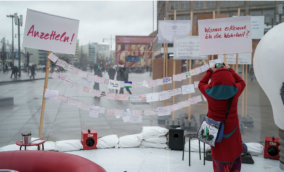 Die Künstlerin Christiane ten Hoevel ließ in ihrer Arbeit ‚Anzetteln‘ Berlinerinnen und Berliner zu Wort kommen. Sie motivierte an den verschiedenen Standorten des Möbelwagens Passanten und ein breites Publikum zum Mitwirken und sammelte vielfältige Meinungsäußerungen. Die Gedanken und Forderungen zu Freiheits- und Menschenrechten wurden auf Protestschildern notiert. Keine Demonstration ohne solche Schilder, das galt auch schon während der Revolution 1918/19. „Anzetteln“ war wie alle Aktionen – ab Februar im „Revolutionszentrum Podewil“ zu sehen.