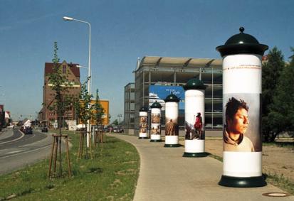 Postkartengrüße von anderen Mauern | Grenzen | Gipfeln ■ ART GOES HEILIGENDAMM stellt 12 Litfaßsäulen im öffentlichen Raum auf, die einerseits Wegmarken zwischen den unterschiedlichen Bespielungsorten bilden, aber auch eine Installation im Stadtraum bilden. Sie tragen künstlerische Werke in den öffentlichen Raum, die sonst nur einem Kunstpublikum vorbehalten sind. Es werden Einzelarbeiten sein oder Narrative in der Ästhetik von Kontaktbögen.